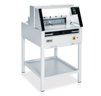 Professional guillotine with EASY-CUT, automatic clamp, programmable power backgauge with touch pad and IR light beam safety curtain on the front table.